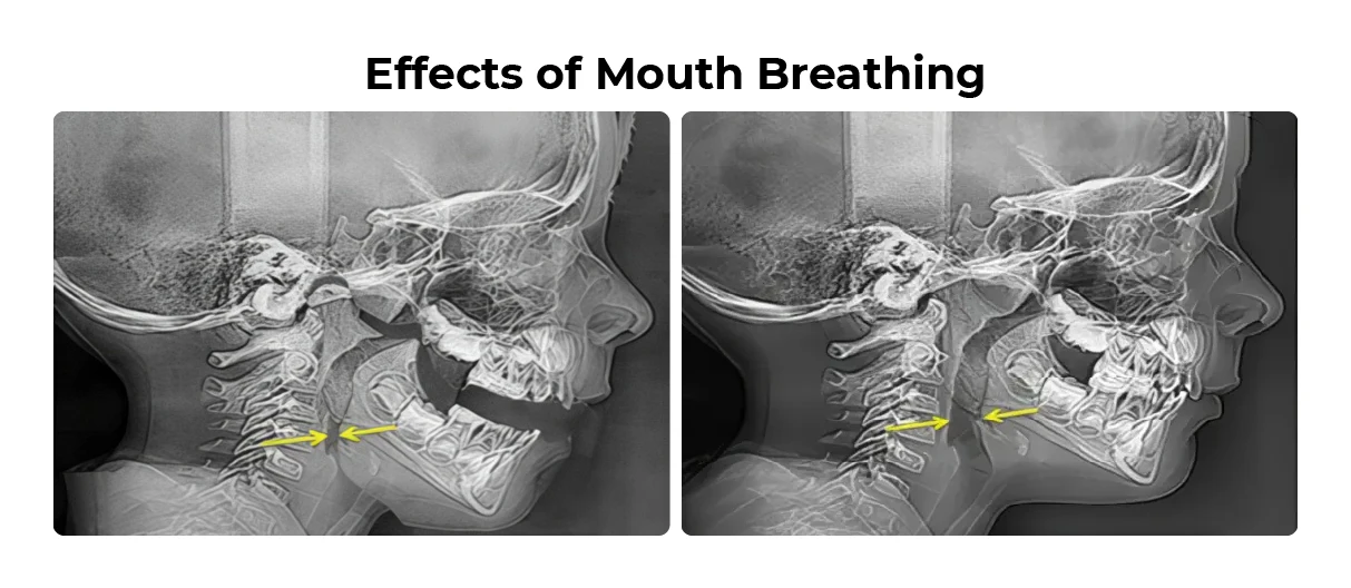 Early evaluation for the signs of poor jaw development can play a critical role in improving a child’s oral and overall health. Mouth breathing at night affects more than just jaw and facial development. When the mouth is open, the lower jaw falls down and backward. The base of the tongue falls backward with it. This backward position of the mandible and tongue reduces the space of the airway behind it, as illustrated in the images below, showing the difference in the airway space when the mouth is open vs closed.