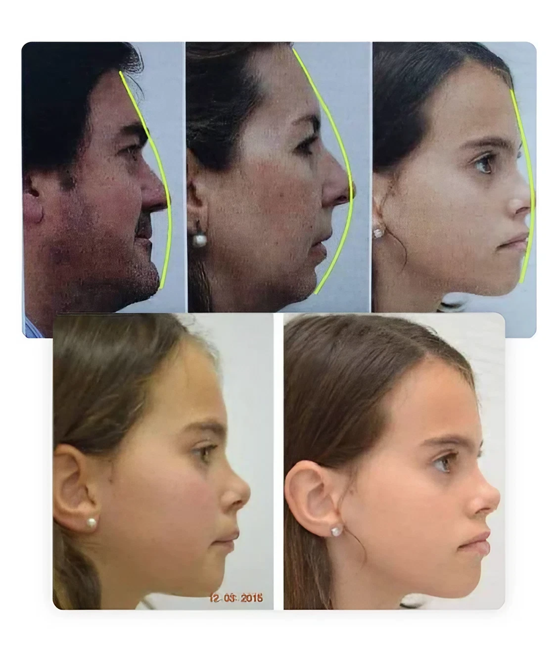 The young girl in the photo has the same genetic code as her parents. In her pretreatment photo, this child shows facial muscle tension with poorly developing jaws and facial profile, much like the profile seen in her mother. With early identification of her soft tissue imbalance by an orthotropic provider and intervention with myofunctional exercises and noninvasive removable appliances, her jaws were able to get back on track and develop to their full potential.
