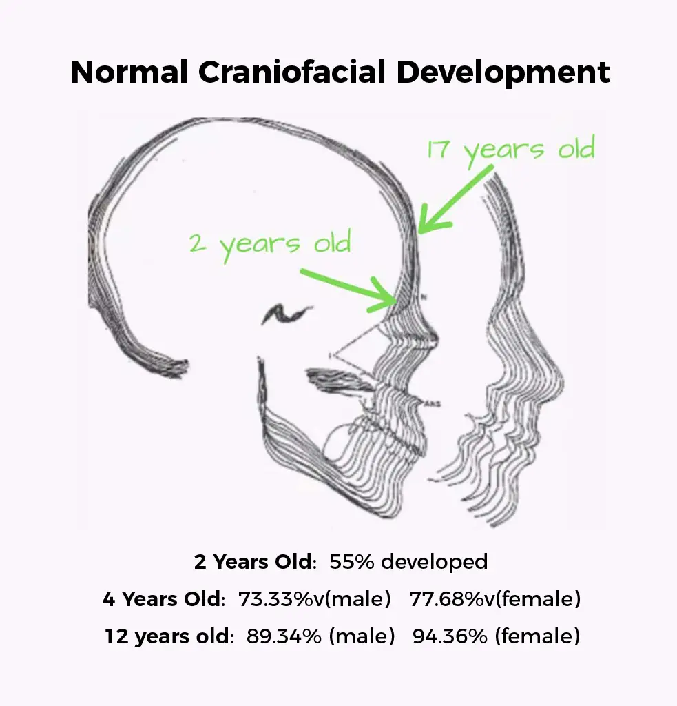 A child’s craniofacial complex has completed 89 to 94 percent of active growth by age 12, with nearly three-quarters of craniofacial growth being complete already by age 4. If our aim is to alter development and stimulate the growth of the bony foundation, then our mantra is “the sooner the better.”