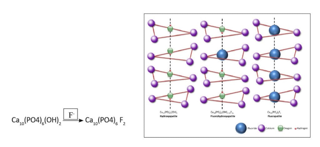 - Too frequent fluoride exposure, particularly during tooth development, can go too far and replace all of the OH groups in HAP to create Fluorapatite which is brittle and more at risk of fracture, as it does not have the flexure of natural Hydroxyapatite or Fluorohydroxyapatite.