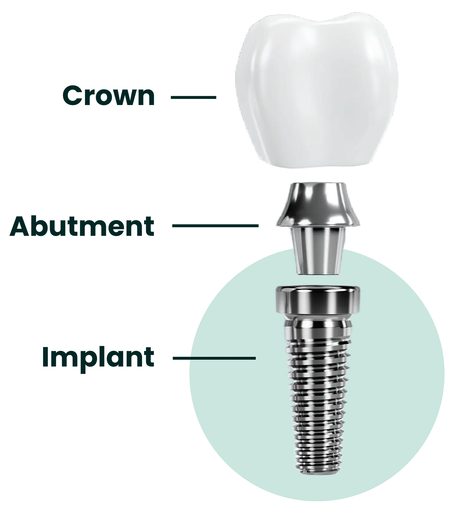 - Abutment – Connects the implant to your new tooth. Only removable by your dentist.