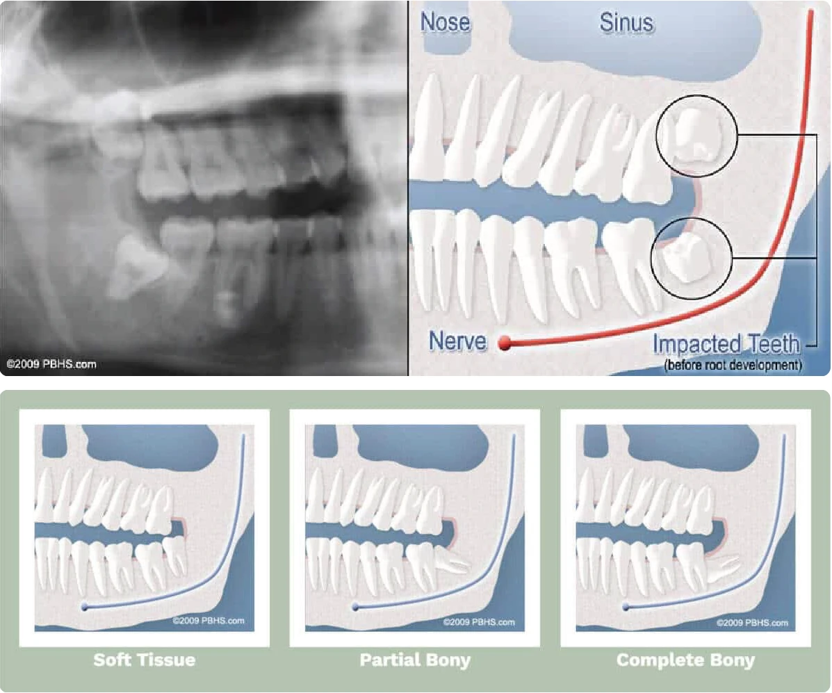 - Complete Bony Impaction: There is NO space for the tooth to erupt. It remains embedded in the jawbone or if even partially visible requires complex surgical techniques for removal. The impacted wisdom tooth may also be in an unusual position and difficult to remove. This situation can also arise when the shape or size of the jawbone and other facial structures make removal of this tooth significantly more complex.